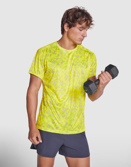Round neck, with reinforced seams in contrasting fluorescent yellow. Fits on sides, sleeves and shoulders with overlock stitch in the same tone.