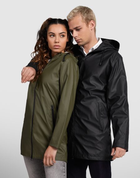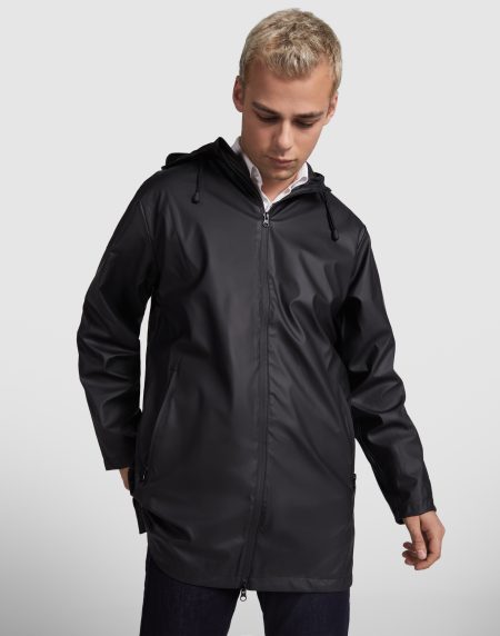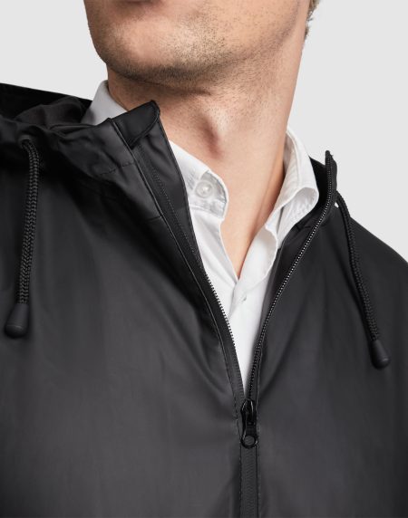 Capuz fixo com viseira. Fechos e costuras termo seladas. Detalhes em preto a contrastar. Dois bolsos laterais com fecho. Cós frontal com abertura.