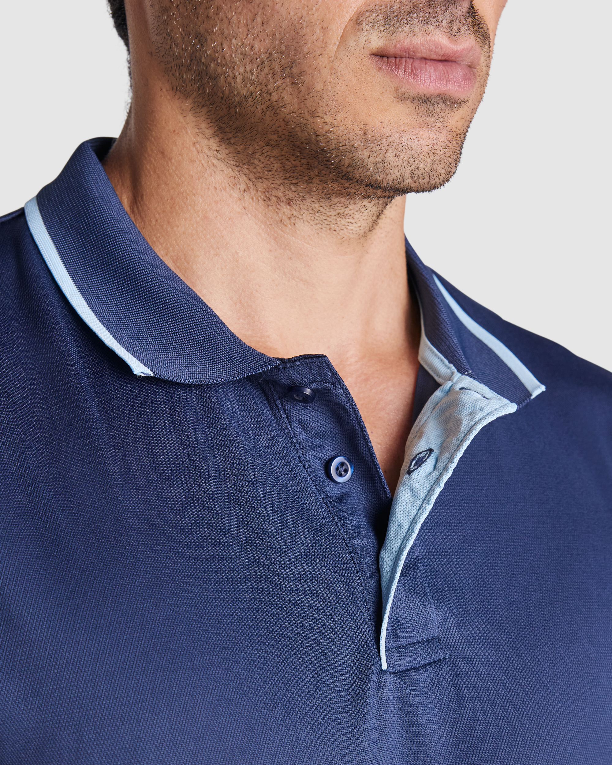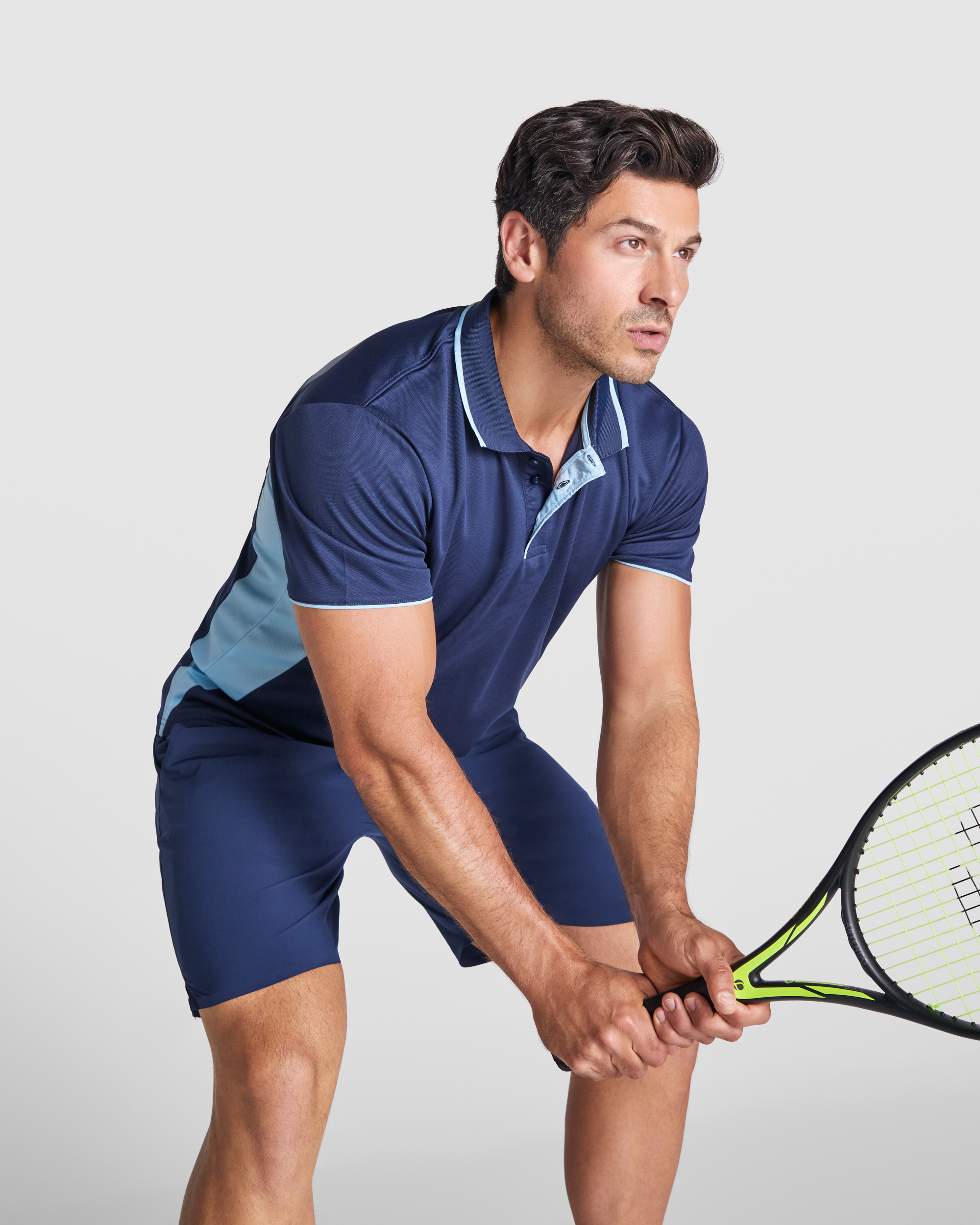 Combinado de duas cores. Gola abetuada, tapa costuras e lapela em contraste de cor. Tecido transpirável de fácil lavagem e secagem rápida.