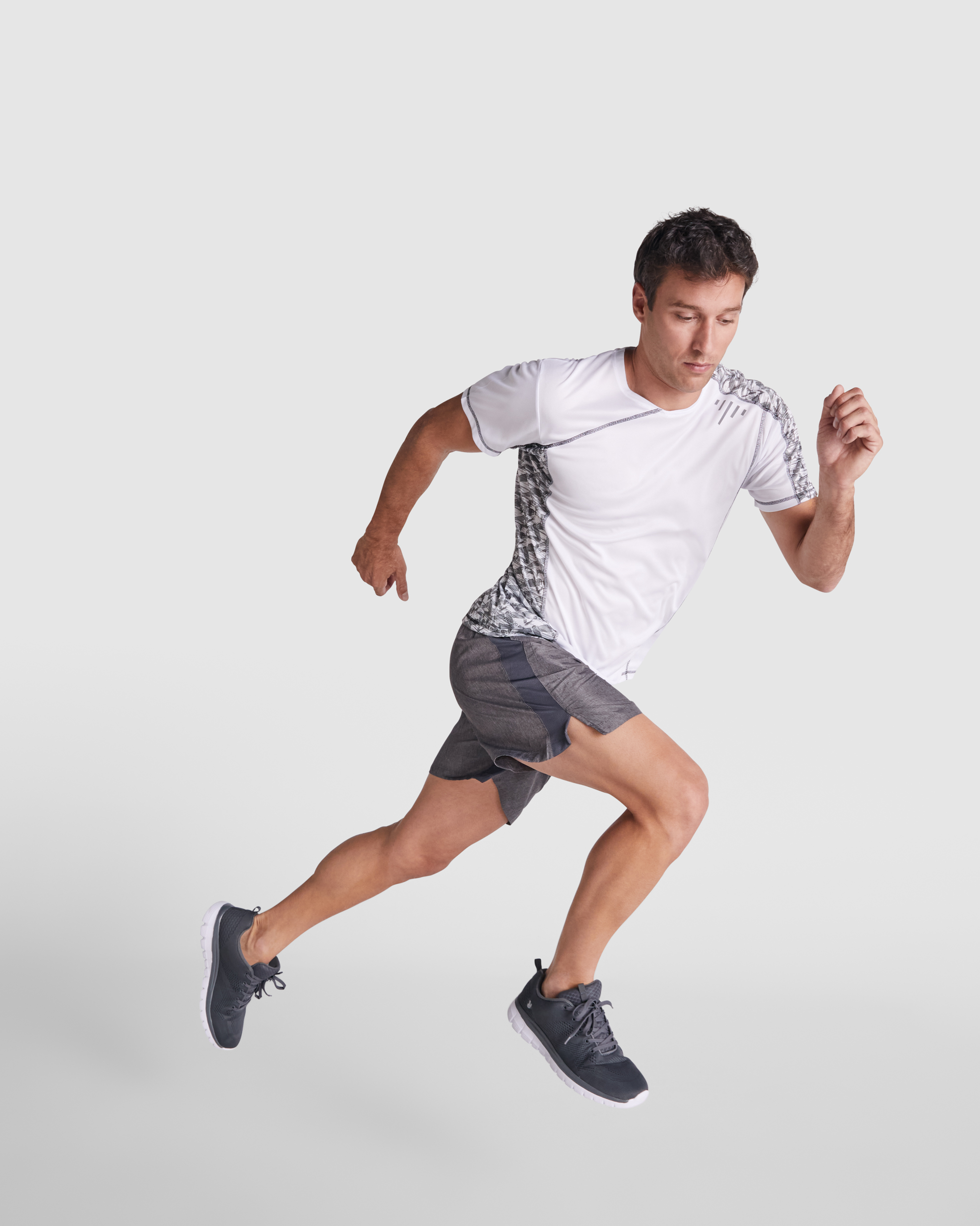 T-shirt técnica de manga reglan com encaixes estampados. Poliéster reciclado. Ponto overloque em flúor. Cós traseiro arredondado.